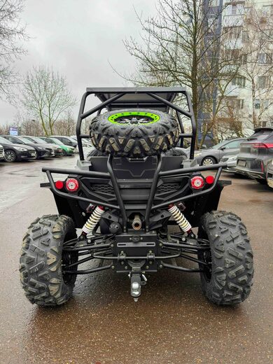 Четырехместный баггиДля тех, кто любит путешествовать компанией по бездорожью, представлен четырехместный багги – мощный, вместительный и готовый к любым испытаниям.Сердце багги – надежный V-образный двухцилиндровый двигатель (799 см³, 59 л.с.) с жидкостным охлаждением, обеспечивающий стабильную работу в самых сложных условиях. Использует АИ-92, что делает эксплуатацию экономичной.Превосходная проходимость – благодаря вариаторной трансмиссии с возможностью переключения между 2WD и 4WD и передним дифференциалом. Независимая подвеска с двойными А-образными рычагами и ходом 110 мм (спереди) / 95 мм (сзади) гарантирует плавный ход по бездорожью. Опционально доступны азотные амортизаторы для повышенной выносливости.26-дюймовые шины (26x10 R14) с легкосплавными дисками и гидравлическими тормозами обеспечивают уверенное движение и контроль в любых условиях. Клиренс 29 см позволяет преодолевать серьезные препятствия, а электрическая лебедка на 1600 кг выручит в сложных ситуациях.Комфорт и управляемость:Электроусилитель руля (EPS) – легкое и точное управление.
