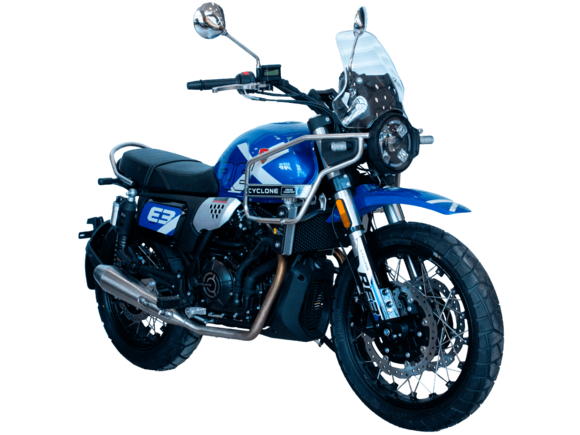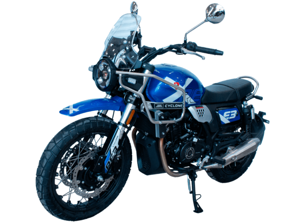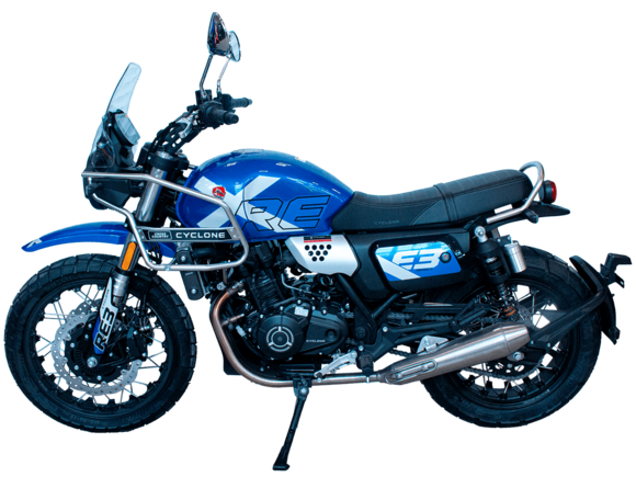 CYCLONE RE3 Scrambler (SR400-A) – универсальный мотоцикл, объединяющий в себе черты городского мотоцикла и эндуро. Управляя им, можно бросить вызов и городским пробкам, и скоростным автострадам, и всевозможному лёгкому бездорожью. Его дизайн отдаёт дань уважения каферейсерской тематике.Двухцилиндровый четырёхтактный двигатель объёмом 401 см3 выдаёт 43 л.с. на 9500 об/мин. Инжекторный впрыск топлива с инжектором BOSCH увеличивает топливную экономичность, а также позволяет добиться высокой приёмистости и неприхотливости агрегата. Жидкостная система охлаждения не допустит перегрева двигателя даже при самом агрессивном вождении. На мотоцикл установлена 6-ступенчатая механическая коробка передач.Максимальная скорость мотоцикла составляет 140 км/ч.Мотоцикл оснащён классическими спицованными колёсами диаметром 17 и 19 дюймов и имеет достаточно большой дорожный просвет – 22 см. С неровностями дороги эффективно справляются телескопическая вилка перевёрнутого типа спереди и маятник с двумя амортизаторами сзади. Ход передней подвески составляет 130 мм, задней – 81 мм. Оба компонента подвески являются регулируемыми. Эффективное и безопасное замедление с любых скоростей обеспечивают гидравлические дисковые тормоза с ABS спереди и сзади.Клиренс мотоцикла составляет 220 мм. Объём топливного бака – 19 л. Снаряжённая масса – 200 кг.На данной модели штатно установлены дуги безопасности, а также имеется бортовой компьютер с цветным дисплеем, USB-порт и подсветка пультов.RE3 Scrambler сочетает в себе отличные технические характеристики, комфорт и надёжность, что позволяет вам ощутить настоящую свободу на любой дороге с любым покрытием.