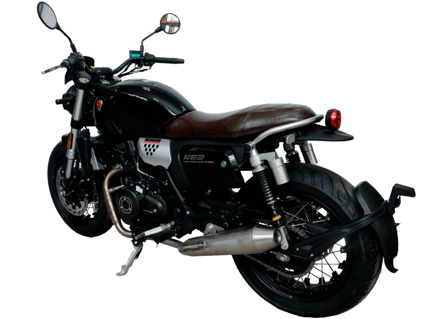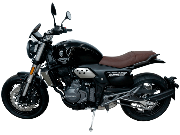 CYCLONE RE3 (SR400) – классик, в котором подчёркнутая простота объединяется с современными технологиями.Двухцилиндровый четырёхтактный двигатель объёмом 401 см3 выдаёт 43 л.с. на 9500 об/мин. Максимальный крутящий момент достигается на 8000 об/мин и составляет 34 Н·м. Инжекторный впрыск топлива с инжектором BOSCH увеличивает топливную экономичность, а также позволяет добиться высокой приёмистости и неприхотливости агрегата. Жидкостная система охлаждения не допустит перегрева двигателя даже при самом агрессивном вождении. На мотоцикл установлена 6-ступенчатая механическая коробка передач.Максимальная скорость мотоцикла составляет 140 км/ч.RE3 оснащён классическими спицованными колёсами диаметром 17 дюймов. Колёса обуты в бескамерные покрышки TIMSUN. С неровностями дороги эффективно справляются регулируемая телескопическая вилка перевёрнутого типа спереди и маятник с двумя амортизаторами сзади. Ход передней подвески составляет 110 мм, задней – 81 мм. Эффективное и безопасное замедление с любых скоростей обеспечивают гидравлические дисковые тормоза с ABS спереди и сзади.Клиренс мотоцикла составляет 145 мм. Объём топливного бака – 19 л. Снаряжённая масса – 186 кг.Из дополнительного оборудования можно выделить USB-порт, подсветку пультов и датчики давления в шинах.Мотоцикл сочетает в себе отличные технические характеристики, комфорт и надёжность, что позволяет вам ощутить настоящую свободу на любой дороге.