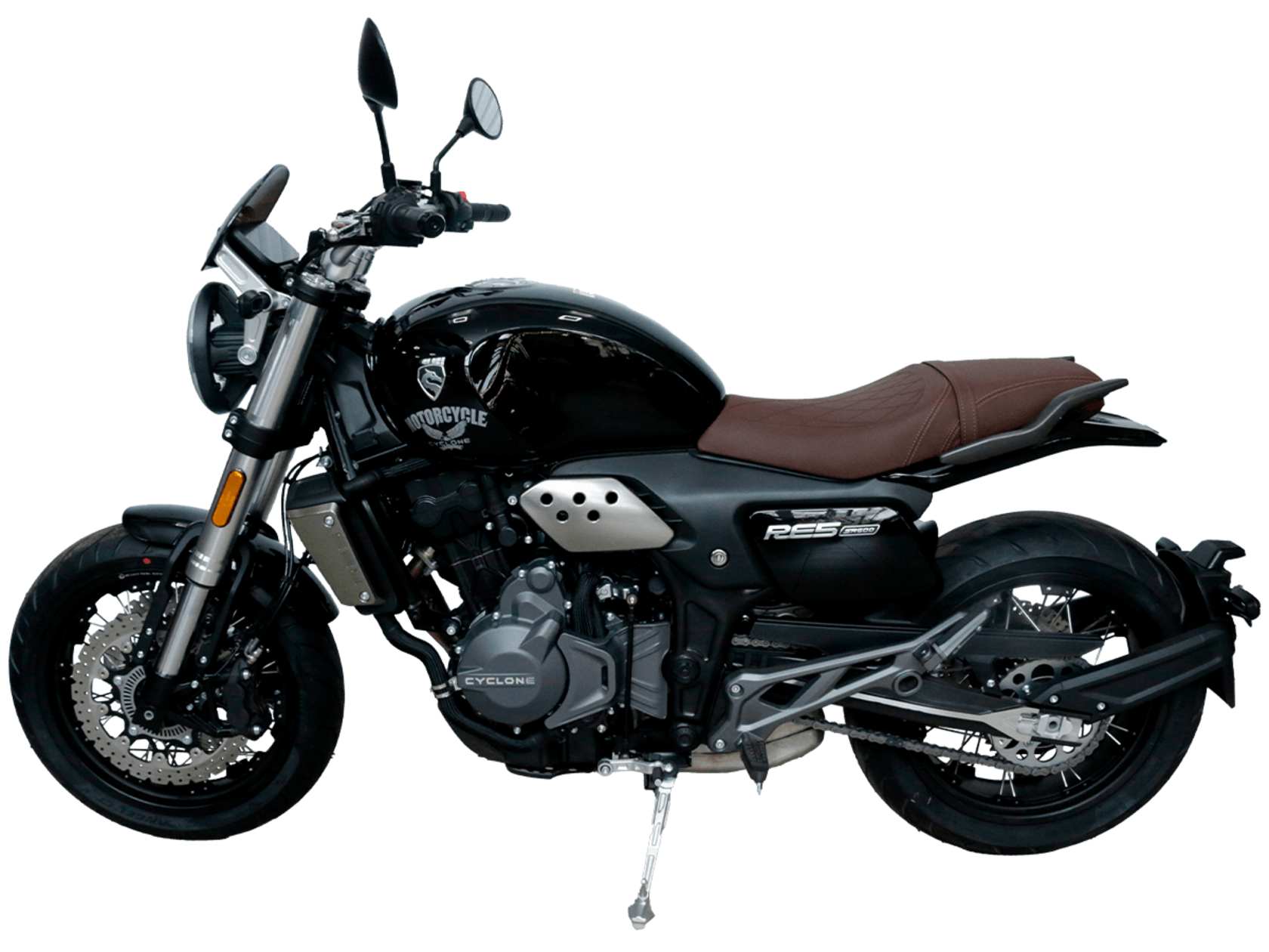 CYCLONE RE5 (SR600) – классик, в котором брутальная простота объединяется с современными технологиями. Данная модель является самой крупнокубатурной среди классических мотоциклов компании CYCLONE.Двухцилиндровый четырёхтактный двигатель объёмом 550 см3 выдаёт 60 л.с. на 8500 об/мин. Максимальный крутящий момент достигается на 6500 об/мин и составляет 55 Н·м. Инжекторный впрыск топлива с блоком управления BOSCH увеличивает топливную экономичность, а также позволяет добиться высокой приёмистости и неприхотливости агрегата. Жидкостная система охлаждения не допустит перегрева двигателя даже при самом агрессивном вождении. На мотоцикл установлена 6-ступенчатая механическая коробка передач.Максимальная скорость мотоцикла составляет 170 км/ч.RE5 оснащён классическими спицевыми колёсами диаметром 17 дюймов. Колёса обуты в бескамерные покрышки от легендарной фирмы PIRELLI. С неровностями дороги эффективно справляются телескопическая вилка перевёрнутого типа спереди и маятник с моноамортизатором сзади. Ход передней подвески составляет 120 мм, задней – 50 мм. Оба компонента подвески являются регулируемыми. Эффективное и безопасное замедление с любых скоростей обеспечивают гидравлические дисковые тормоза с ABS спереди и сзади. Тормозные системы произведены известной испанской фирмой J.JUAN (входящей в легендарный холдинг BREMBO).Клиренс мотоцикла составляет 155 мм. Объём топливного бака – 20 л. Снаряжённая масса – 204 кг.Из дополнительного оборудования можно выделить USB-порт и датчики давления в шинах.Мотоцикл сочетает в себе отличные технические характеристики, комфорт и надёжность, что позволяет вам ощутить настоящую свободу на любой дороге.