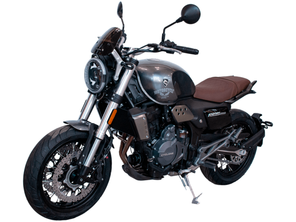 CYCLONE RE5 (SR600) – классик, в котором брутальная простота объединяется с современными технологиями. Данная модель является самой крупнокубатурной среди классических мотоциклов компании CYCLONE.Двухцилиндровый четырёхтактный двигатель объёмом 550 см3 выдаёт 60 л.с. на 8500 об/мин. Максимальный крутящий момент достигается на 6500 об/мин и составляет 55 Н·м. Инжекторный впрыск топлива с блоком управления BOSCH увеличивает топливную экономичность, а также позволяет добиться высокой приёмистости и неприхотливости агрегата. Жидкостная система охлаждения не допустит перегрева двигателя даже при самом агрессивном вождении. На мотоцикл установлена 6-ступенчатая механическая коробка передач.Максимальная скорость мотоцикла составляет 170 км/ч.RE5 оснащён классическими спицевыми колёсами диаметром 17 дюймов. Колёса обуты в бескамерные покрышки от легендарной фирмы PIRELLI. С неровностями дороги эффективно справляются телескопическая вилка перевёрнутого типа спереди и маятник с моноамортизатором сзади. Ход передней подвески составляет 120 мм, задней – 50 мм. Оба компонента подвески являются регулируемыми. Эффективное и безопасное замедление с любых скоростей обеспечивают гидравлические дисковые тормоза с ABS спереди и сзади. Тормозные системы произведены известной испанской фирмой J.JUAN (входящей в легендарный холдинг BREMBO).Клиренс мотоцикла составляет 155 мм. Объём топливного бака – 20 л. Снаряжённая масса – 204 кг.Из дополнительного оборудования можно выделить USB-порт и датчики давления в шинах.Мотоцикл сочетает в себе отличные технические характеристики, комфорт и надёжность, что позволяет вам ощутить настоящую свободу на любой дороге.
