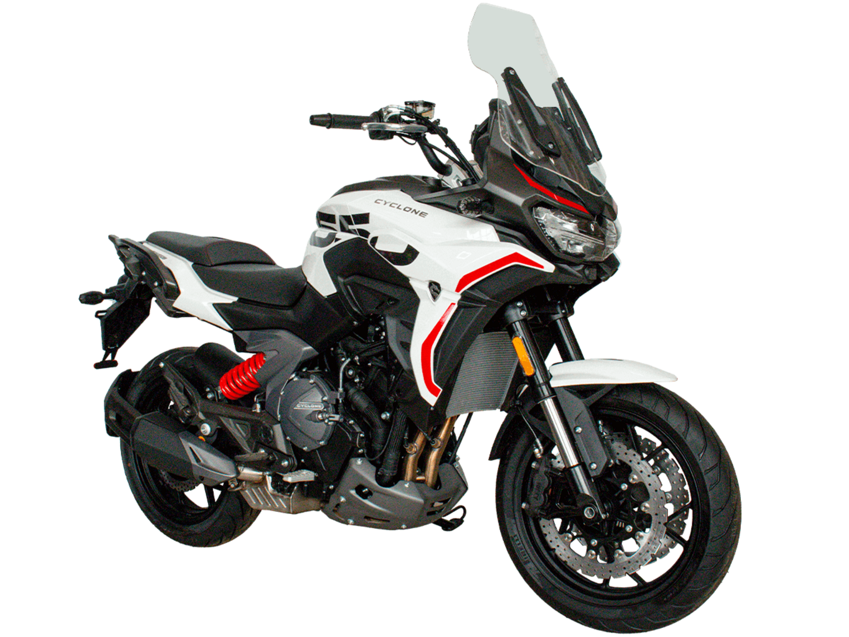 CYCLONE RX6 (SR650) – туристический эндуро для покорения самых непростых и протяжённых маршрутов. Он обладает агрессивным и современным дизайном, который выгодно выделяет его из всех остальных мотоциклов в своём классе. Мотоцикл дарит своему владельцу абсолютную свободу передвижения, позволяя долго и быстро ехать по шоссе, а при желании съезжать на такие дороги, по которым не проедет ни один дорожный мотоцикл. Небольшие габариты этого байка позволяют с успехом использовать его, как повседневный дорожный мотоцикл.Данная модель является самой крупнокубатурной в модельном ряде компании CYCLONE. Рядный двухцилиндровый четырёхтактный двигатель объёмом 650 см3 выдаёт мощность в 71 л.с. на 8500 об/мин. Максимальный крутящий момент достигается на 7000 об/мин и составляет 62 Н·м. Инжекторный впрыск топлива с блоком управления BOSCH увеличивает топливную экономичность, а также позволяет добиться высокой приёмистости и неприхотливости агрегата. Жидкостная система охлаждения не допустит перегрева двигателя даже при самом агрессивном вождении. На мотоцикл установлена 6-ступенчатая механическая коробка передач.Максимальная скорость мотоцикла составляет 180 км/ч.Модель оснащена литыми алюминиевыми дисками диаметром 17 дюймов. Колёса обуты в бескамерные покрышки от легендарной фирмы PIRELLI. С неровностями дороги эффективно справляются компоненты производства культовой японской компании KYB – телескопическая вилка перевёрнутого типа спереди и маятник с моноамортизатором сзади. Ход передней подвески составляет 130 мм, задней – 51 мм. Оба компонента подвески являются регулируемыми. Эффективное и безопасное замедление с любых скоростей обеспечивают гидравлические дисковые тормоза с двухканальной системой ABS спереди и сзади. Тормозные системы произведены известной испанской фирмой J.JUAN (входящей в легендарный холдинг BREMBO).Мотоцикл отличает хорошо продуманная компоновка с высоко расположенным радиатором. Высота 820 мм по седлу позволяет чувствовать себя комфортно даже райдерам небольшого роста. На данной модели установлена металлическая защита выхлопной системы и масляного фильтра. Под пассажирским сиденьем размещён небольшой, но крайне полезный набор инструментов.RX6 (SR650) оснащён бортовым компьютером с информативным цветным дисплеем и кнопками управления на руле, а также двумя штатными видеорегистраторами спереди и сзади. Из других приятных мелочей в допоборудовании мотоцикла стоит выделить регулируемое при помощи кнопки ветровое стекло, датчики давления в шинах, подсветку пультов, бесключевой доступ и 2 USB-порта.Клиренс мотоцикла составляет 165 мм. Объём топливного бака – 20 л. Снаряжённая масса – 245 кг.Мотоцикл сочетает в себе отличные технические характеристики, богатое оснащение, комфорт и надёжность, что позволяет вам ощутить настоящую свободу, отправившись на нём в любое путешествие.