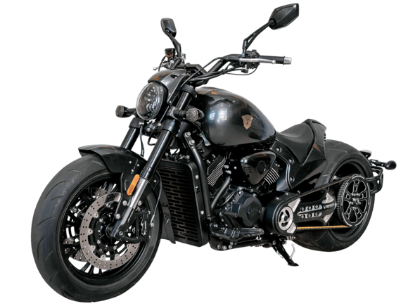 GROZA Wolverine 800 – ультимативный круизёр, который будто бы сошёл со страниц эксклюзивного каталога кастом-байков. Модель названа в честь росомахи – одного из самых свирепых, ловких и бескомпромиссных хищников в животном мире. Пилотируя этот байк, вы не имеете шанса остаться в потоке незамеченным. А в случае, если кто-то на светофоре решит посостязаться в дрэг-рейсинге, 800-кубовый V-твин и гигантская задняя покрышка не оставят преследователям никаких шансов.Двухцилиндровый V-образный четырёхтактный двигатель объёмом 800 см3 мощностью 61 л.с. при высоких показателях динамики и отличном крутящем моменте способен разгонять аппарат до 180 км/ч. Инжекторный впрыск топлива с инжектором DELPHI увеличивает топливную экономичность, а также позволяет добиться высокой приёмистости и неприхотливости агрегата. Привод на ведущее колесо осуществляется ремнём знаменитой марки USA Gates. Жидкостная система охлаждения не допустит перегрева мотора даже при самом агрессивном вождении. Радиатор оснащён фирменными вентиляторами Panasonic, способными обеспечить сильный отвод тепла даже на перегруженных городских дорогах. Металлическая крышка на радиаторе эффективно защищает от ударов твёрдых предметов.Аппарат имеет 6-ступенчатую механическую коробку передач с классической схемой “1-N-2-3-4-5-6”. На мотоцикл установлены литые алюминиевые диски диаметром 17 дюймов спереди и 18 дюймов сзади. Ширина передней покрышки – 140 мм, а задней – рекордные 360 мм! С неровностями дороги эффективно справляются телескопическая вилка перевёрнутого типа спереди и маятник с двумя газонаполненными амортизаторами сзади. Подвеска имеет 7 ступеней регулировки, что обеспечивает лёгкую перестройку на различные режимы езды. Для всего класса круизёров такая опция – большая редкость. Эффективное и безопасное замедление с любых скоростей обеспечивают гидравлические дисковые тормоза спереди и сзади от компании NISSIN. Мотоцикл оснащён ультраминималистичным хвостовым обтекателем и изумительным “ракетным” глушителем с углепластиковыми щитками для защиты ноги, произведённым легендарной фирмой AKRAPOVIC.Wolverine 800 сочетает в себе отличные технические характеристики, богатое оснащение, комфорт и надёжность, что позволяет вам ощутить настоящую свободу на любой дороге.