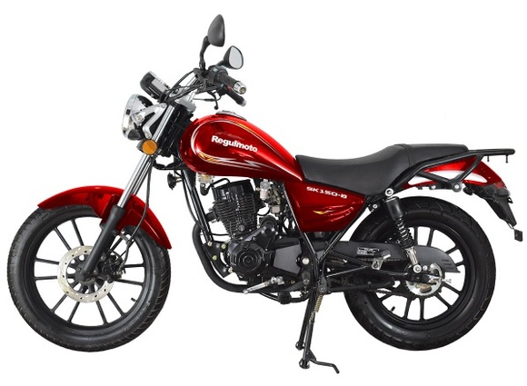 Несмотря на классический внешний вид Regulmoto SK 150-8 отличается достаточно интересным и продуманным дизайном. В раме мотоцикла установлен одноцилиндровый 4-тактник с воздушным охлаждением с рабочим объемом в 149 см3. Двигатель можно запускать как кнопкой электростартера, так и при помощи традиционного кик-стартера. В целом байк выглядит лаконичным и современным – еще одной приметой актуальных трендов стали литые диски переднего 18-дюймового и заднего 16-дюймового колес. Также на переднем колесе установлен дисковый тормоз, хотя в ступице заднего колеса реализован проверенный многими десятилетиями вариант с тормозом барабанного типа. Характерная для «дорожников» подвеска представлена телескопической вилкой впереди и двумя амортизаторами сзади.