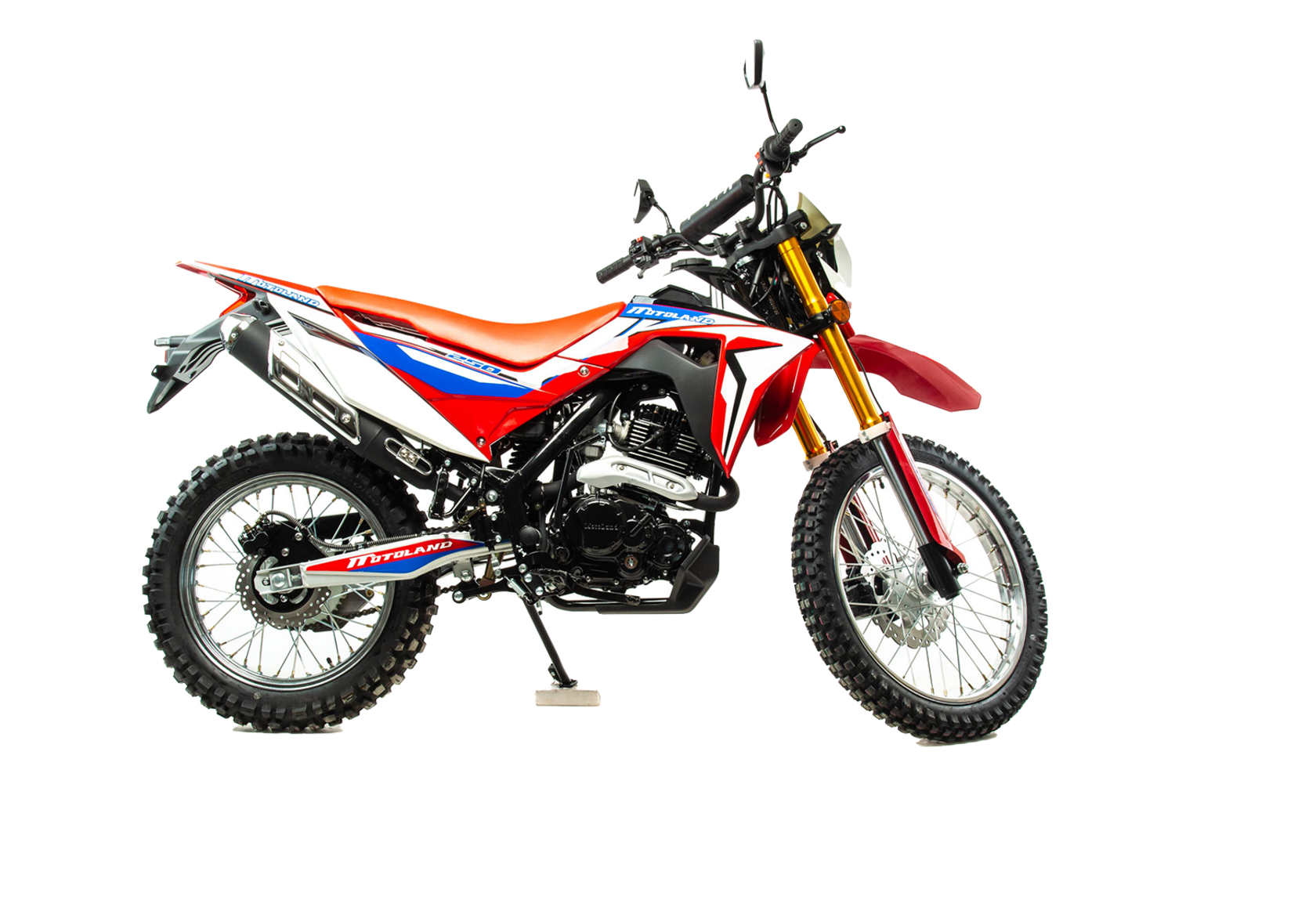 Motoland CRF ST ENDURO предназначен для езды по бездорожью, эндуро соревнований, подходит для города, шоссейных и сельских дорог, имеет ПТС. Китайский Эндуро компании MotoLand оснащён одноцилиндровым 4-тактным двигателем 170 FMN мощностью объемом 250 см³. Мотор мощностью 16 л. с. даёт возможность разгоняться на Эндуро по ровной трассе до 120 км/ч. Расход топлива — 5 литров на 100 км. Коробка передач механическая, 5-скоростная. Для запуска мотора используйте электростартёр или кикстартёр. Установлена электронная система зажигания (CDI). Эндуро MotoLand отличаются высокой проходимостью, отлично ведут себя на мягком грунте и песке, легко преодолевают препятствия. Спортивный характер Эндуро 250 подчёркивается современным дизайном. Классическая конструкция акцентирует внимание на сильных сторонах мотоцикла, которому не страшны грязь, брёвна, камни и другие преграды. Мотоцикл Motoland CRF ST ENDURO доступен в красном цвете. Мотолэнд Эндуро весит 135 кг. Длина мотоцикла — 2100 мм, высота по седлу — 890 мм. Эндуро подходит для пользователей любого роста, хорошо держит баланс и позволяет уверенно сохранять равновесие даже на сложных участках эндуро трасс. Колёса спицованные, сделаны из алюминия. Размер переднего колеса — 21 дюйм (530 мм), заднего — 18 дюймов (450 мм). Передние и задние тормоза дисковые. Покрышки с крупными шипами подходят для бездорожья, лесных дорог, песка и мягкого грунта. При этом купить мотоцикл Эндуро можно не только для соревнований, но и для езды по трассе и городу. У Motoland CRF ST ENDURO для этого есть всё необходимое: ПТС, зеркала заднего вида, поворотники, стоп-сигнал, фара дальнего и ближнего света. На заднем крыле установлено крепление для номера. Рама у мотоцикла стальная, хорошего качества. Передняя вилка — перевёрнутая телескопического типа, дополнительно защищена жёстким пластиком. Задняя подвеска с моноамортизатором. Руль Эндуро усилен пластиковыми рамками, которые защищают руки гонщика от веток и травм при падениях. Приборная панель оснащена ЖК-экраном, на котором отображается вся информация о состоянии Эндуро: обороты, пробег, скорость и другие необходимые данные. У нас Вы можете купить этот мотоцикл с бесплатной доставкой по РФ. Также его можно приобрести в рассрочку или в кредит.