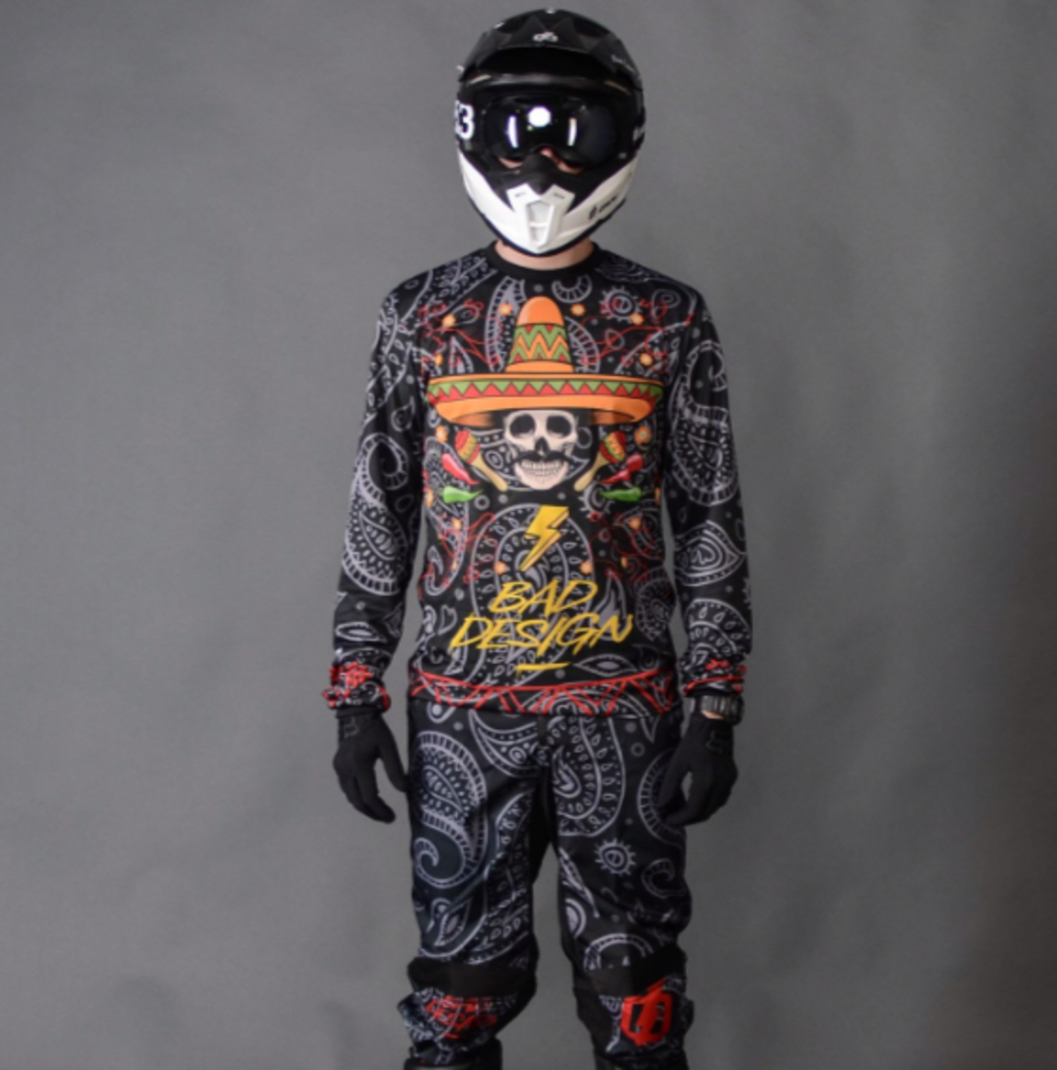 Классический комплект момтоэкипировки.Особенности:Штаны:• Кожаные накладки на внутренней стороне голени;• Замок-трещётка с регулировкой;• Боковые утяжки на липах;• Крой выполнен с учётом наколенников;• Мягкие вставки расположены в области колен;• Тянущийся материал в нужных местах для свободы движений.Джерси:• Крой реглан или классика;• Учтён запас под налокотники;• Лёгкий и быстросохнущий материал;• Принт не выстирывается и не выгорает;• Выбор тканей и кастомизация(Нанесение номера и фамилии на экипировку - бесплатно.Разработка вашего дизайна по ТЗ, оплачивается дополнительно).Ткани ( на заказ и на выбор, ложная сетка уже входит):• Ложная сетка(стандарт): Самая распространенная ткань в производстве формы. Отлично зарекомендовала себя, как золотая середина. Мягкая на ощупь, с выраженной фактурой;Производство: Индонезия;• Состав: 100% Полиэстер;• Плотность: 135 гр.• Ткань Cube:Уникальная ткань. Сделана из FDY нити (дополнительно полированный полиэстр). Даёт ощущение шёлка, отлично охлаждает и отводит влагу. Не боится зацепов, не мнется, за счёт шлифовки дает чуть более сочные цвета формы.•Производство: Европа;• Состав: 100% Полиэстер;• Плотность: 135 гр.• Ткань CoolMax: Ткань с технологией CoolMax - отличные характеристики влагоотвода и комфорта. Мягкая, шёлковая на ощупь, ткань. Подходит для профессиональных занятий спортом.• Производство: Турция;• Состав: 100% Полиэстер;• Плотность: 130 гр.Ткань Олимп(стандарт):• Ткань с ярко выраженными отверстиями. Отлично продувается. Особыми свойствами не обладает.Часто используется для вставок.• Производство: Турция;• Состав: 100% Полиэстер;• Плотность: 135 гр.