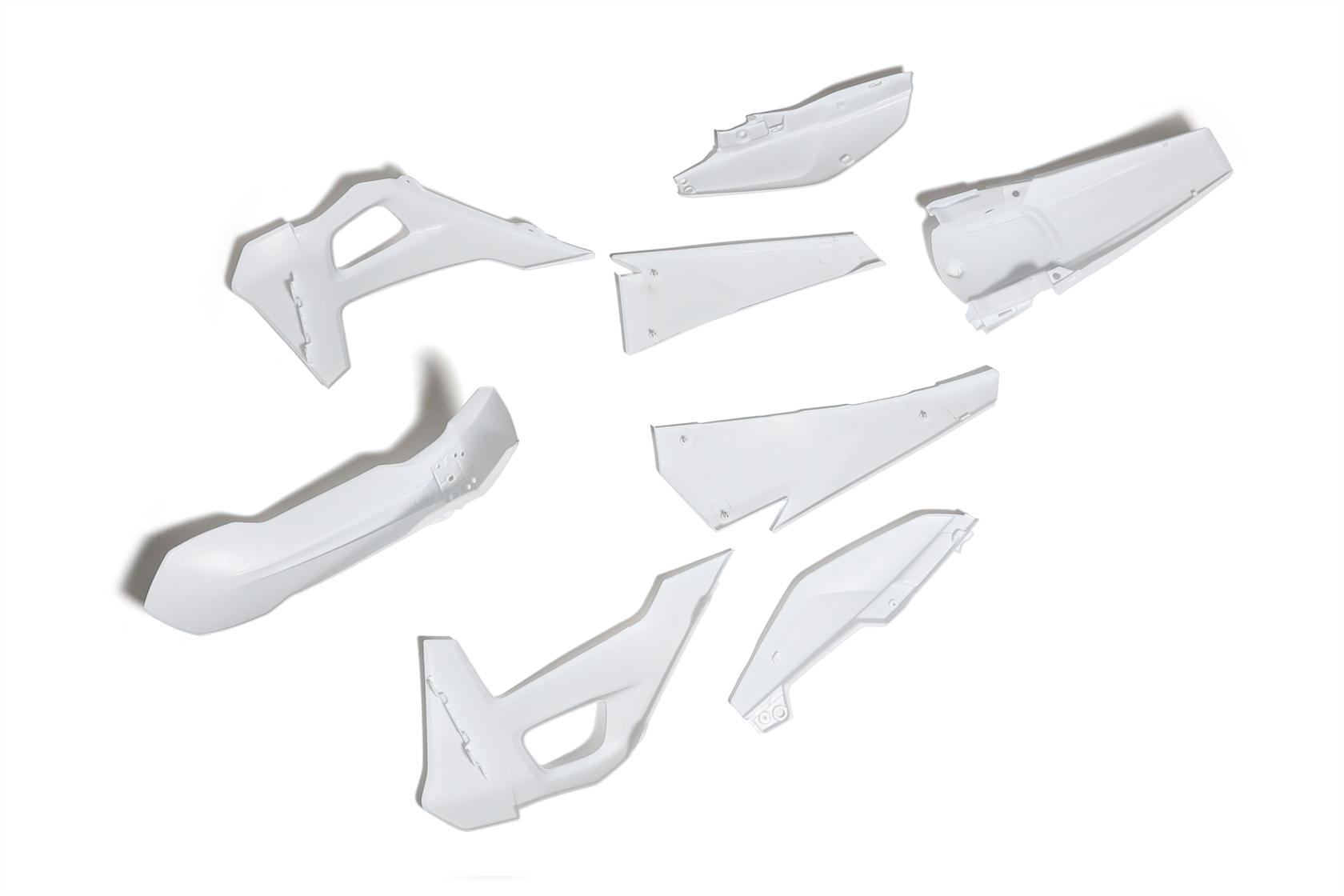Комплект пластика для BRZ H6, белый цвет. Дизайн выполнен в стиле Husqvarna, что придаёт мотоциклу современный и узнаваемый внешний вид. Комплект не имеет аналогов — является уникальной разработкой для данной модели, идеально подгоняется по геометрии и креплениям к раме BRZ H6. Пластик высокопрочный, устойчив к ударам, ультрафиолету и истиранию, рассчитан на эксплуатацию в самых разных условиях (эндуро, мотокросс, экстремальные поездки).