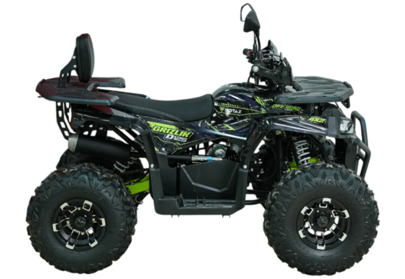 Квадроцикл бензиновый MOTAX GRIZLIK D125 LUX. Оборудован четырехтактным бензиновым двигателем, 125 кубов, мощностью 10 л.с. Развивает скорость до 55 км\ч. Допустимая нагрузка 100 кг.