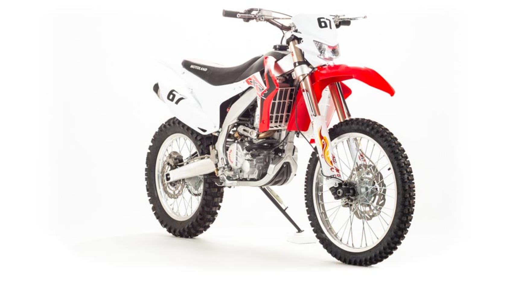 Обновленный мотоцикл Кросс 250см3 XR25FA ,это все тот-же мотоцикл только на данной модели установлены амортизаторы Fast Ace имеющая настройки сжатия и отбоя переднего и заднего амортизатора . Хорошее качество сборки и доступные цены на комплектующие позволяют поддерживать технику в исправном состоянии без больших затрат при любой интенсивности эксплуатации. Масса мотоцикла составляет порядка 120 кг. Габариты довольно большие – длина составляет 2000 мм., а высота по седлу – 920 мм., ширина руля- 830 мм. поэтому он отлично подойдет для тех, кто имеет рост от 175 см и выше.На мотоцикле установлен обычный для китайских кроссовых мотоциклов двигатель 169 FMM с 17 л.с. мощности, с воздушным охлаждением и рабочим объемом 230 кубов . Диаметр поршня движка составляет 65,5 мм, балансирный вал в конструкции не предусмотрен. Коленвал у мотоцикла Motoland XR 250 имеет палец диаметром 15 мм. Новые партии оснащаются карбюраторами PZ 30 с ускорительным насосом. Для удобства запуска мотора предусмотрен электростартер.Рычаги сцепления и тормоза – обычные, не складные. Передний тормозной диск имеет размер 280 мм., а размер заднего диска составляет 250 мм. Данный мотоцикл комплектуется колесами размерами 18/21 дюймов, размер задней покрышки – 110/90-18, передней- 80/100-21. Установлена 520-я цепь, передняя (ведущая) звезда имеет 13 зубов, задняя (ведомая) – 41 зуб.Подвеска у данной модели имеет стандартную прогрессию, как у большинства «китайцев». Размеры сальников прогрессии – 32х17х4, размеры подшипников – NK 17/16. Если Вам крайне важна качественная подвеска у мотоцикла, вместо предыдущей модели стоит купить Motoland 250 XR Fast Ace. Единственное отличие между ними заключается именно в этой детали, однако оно вносит немало нового в поведение транспорта, переводя его из чисто любительского класса уже в более профессиональный. Подвеска Fast Ace гораздо мягче стандартной, поэтому она во много раз лучше преодолевает неровности. Наличие регулировок позволяет подстроить амортизаторы под индивидуальные предпочтения. Размеры передних амортизаторов Fast Ace составляет d48x51, заднего амортизатора на данной модели составляют 470 мм. Задний маятник мотоцикла тоже стандартный, металлический.У модели Motoland XR 250 руль имеет переменное сечение: в месте установки его размер составляет 28 мм, а на концах под грипсами – 22 мм. Перевернутая вилка позволяет легче преодолевать любые неровности на дороге даже новичкам.Мотоцикл оснащен фарой головного света, что является необходимым условием для езды в сумерках и темноте. Если он покажется Вам недостаточно ярким, вместо стандартной лампы можно установить LED освещение или Биксенон. Переключение света осуществляется ключом зажигания.