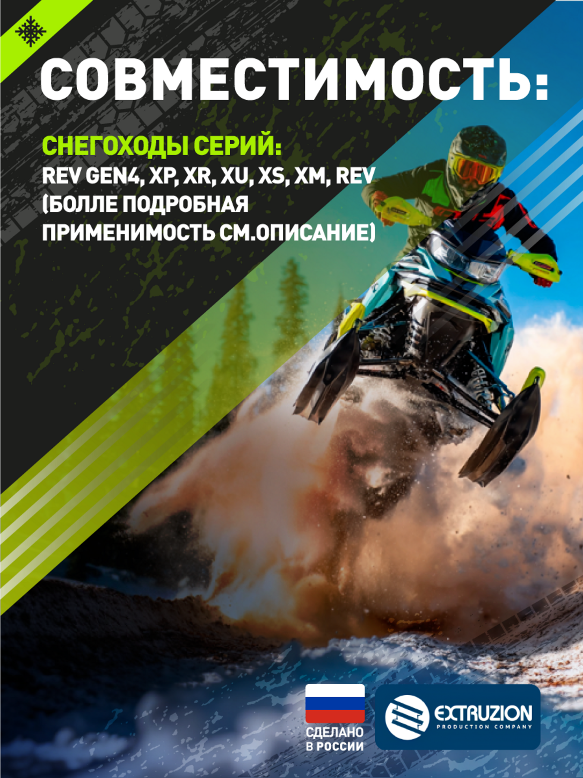 Улучшенная проходимость и управляемость. Повышение плавучести снегохода на рыхлом снегу за счет увеличенной площади контакта Тонкие жесткие внешние кромки обеспечивают отличное сцепление при боковом скольжении Короткая плоская хвостовая часть способствует лучшему контролю на сложном рельефе