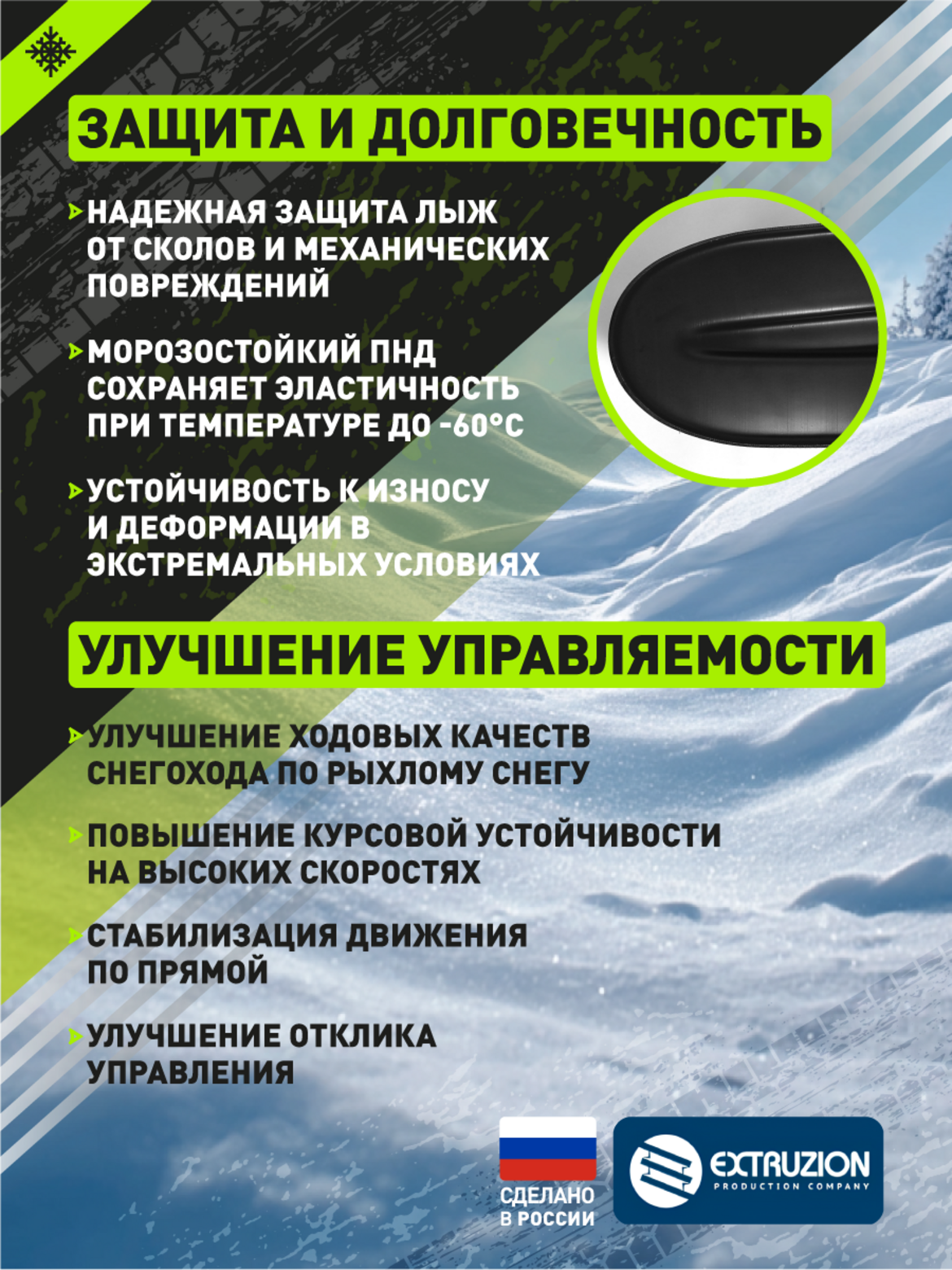 Надежная защита и долговечность. Защищает оригинальные лыжи от сколов, царапин и абразивного износа Изготовлена из морозостойкого ПНД, сохраняющего гибкость при -60C Принимает на себя основную нагрузку, продлевая срок службы лыж