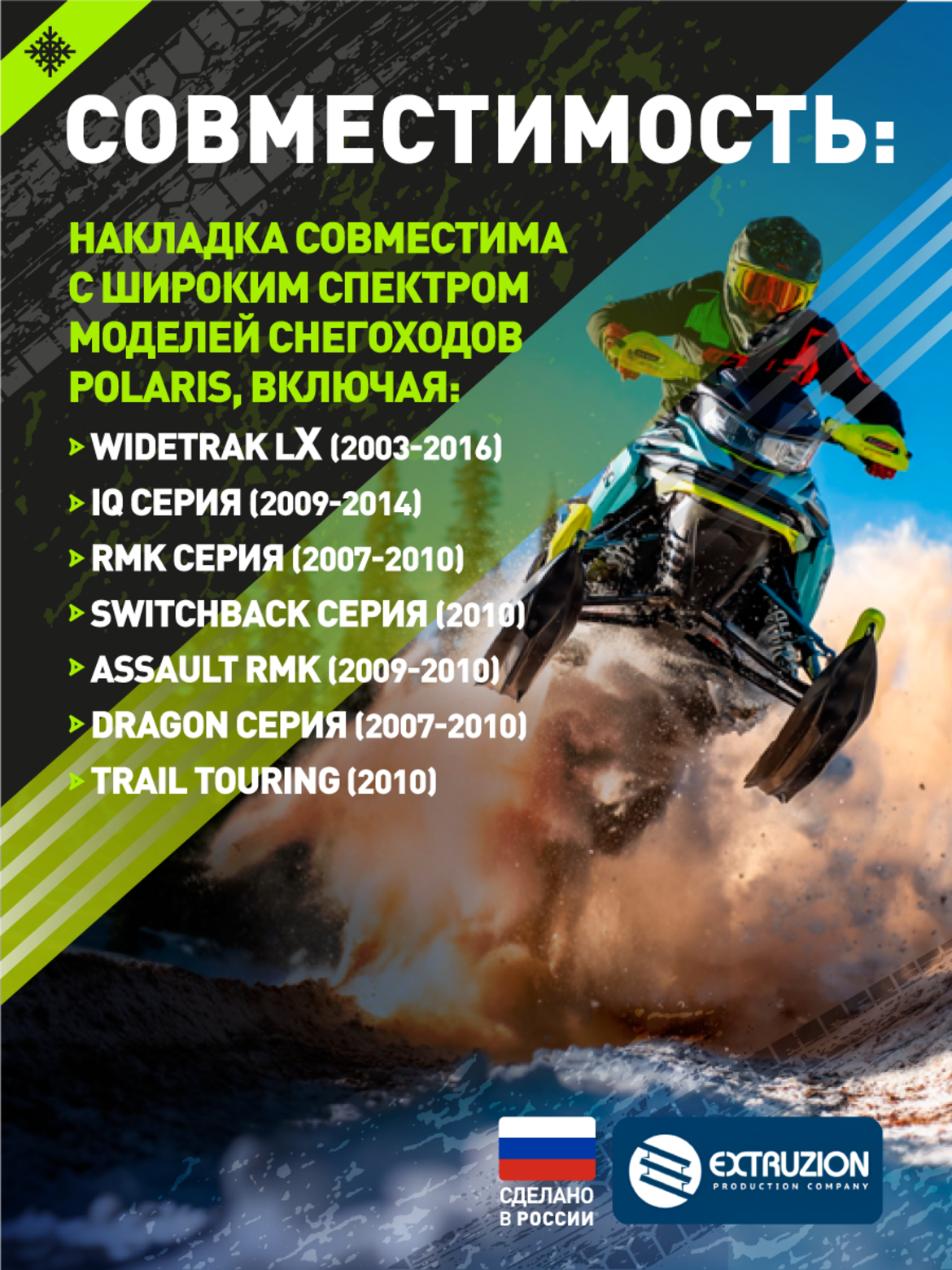 Повышение проходимости и устойчивости. Увеличивает проходимость техники по рыхлому снегу и глубоким сугробам Снижает валкость снегохода и улучшает курсовую устойчивость Увеличивает площадь соприкосновения с поверхностью, предотвращая проваливание