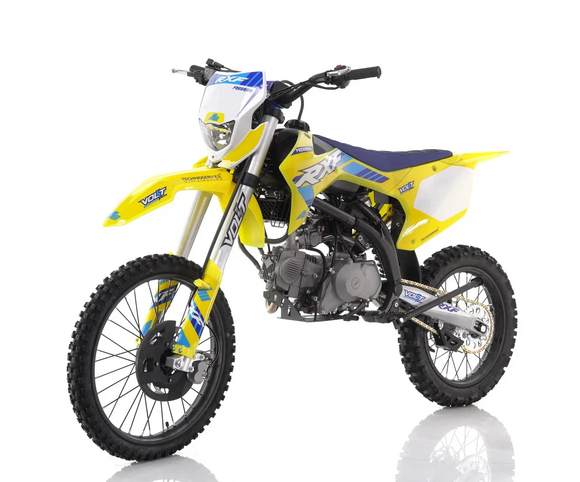 Кроссовый мотоцикл APOLLO RXF Freeride 125 LE отличается продуманностью и надежностью конструкции, о чем говорит и название французского бренда, и масса положительных отзывов пользователей.Хребтовая V-образная рама обновленного РХФ спроектирована специально под большие колеса, между которыми помещается топливный бак на 6,5 литра. Передвигаться по бездорожью стало удобней и из-за увеличенных задних и передних крыльев – грязь не разбрызгивается и не попадает на райдера. Езда в стойке особенно комфортна благодаря увеличенному расстоянию между седлом и подножками. Передняя подвеска – ставшая уже классической VOLT V-ONE на 830 мм, задняя – регулируемая VOLT V-Force на 350 мм.Одноцилиндровый четырехтактный двигатель YX с объемом 125-кубов закрыт от попадания в него посторонних предметов стальной защитой VOLT. На этот мотор установлен карбюратор Molkt PZ26. Классическая механическая четырехступенчатая коробка передач с нейтральной передачей в самом низу стала самым удобным решением.Электростартер очень полезен, когда двигатель заглох в сложных условиях (например, при въезде на гору, пересечении болота), запустить его можно просто нажав кнопку. Предусмотрена фара на случай езды в темное время суток, который можно заменить на щиток с номером, идущим в комплекте. На руле установлены фирменные грипсы Apollo.