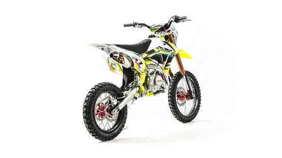 Питбайк Motoland TCX125 14/12 идеален для поездок по грунтовым дорогам и бездорожью. Хорошо чувствует себя на мягком и среднем грунте, разгоняется до 90 км/ч. Оснащён спортивными траверсами, весит всего 70 кг.Питбайк прост в управлении и не требует специального ухода, подойдёт как новичкам, так и любителям мотокросса.Питбайка отличный узнаваемый дизайн. Конструкция подчёркивает неуступчивый спортивный характер, который не остановится ни перед одним препятствием.Комбинированный прочный пластик не ломается при сгибании.Передняя подвеска — телескопическая вилка перевёрнутого типа (с регулировкой по давлению воздуха), которая отлично подходит для преодоления ям, и других неровностей плохих дорог или их отсутствия. Задняя подвеска маятниковая с моноамортизатором. Мотоцикл оснащён одноцилиндровым четырёхтактным двигателем с воздушным охлаждением. Надёжный мотор 152FMI мощностью 8 л. с. и объемом 125 см³ , установленный на усиленной стальной раме, коробка передач полуавтоматическая, четырёхступенчатая.Тормоза дисковые, передний тормозной суппорт двухпоршневой, задний — однопоршневой.Питбайк относится к недорогим моделям, которые при должной эксплуатации работают без сбоев. Не занимает много места в гараже. При необходимости в нём легко сменить любую повреждённую деталь.